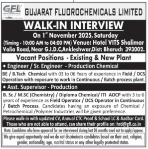 Gujrat fluorochemicals limited wak in interview October 29, 2025 by admin4444 Spread the loveGujrat fluorochemicals limited wak in interview Location:Ankleshwar