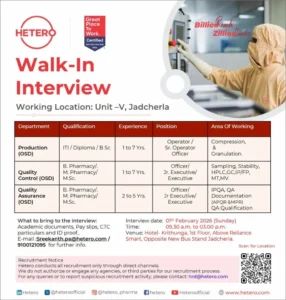 HETERO walk in interview January 30, 2026 by admin4444 Spread the loveHETERO walk in interview Location:Jadcherla